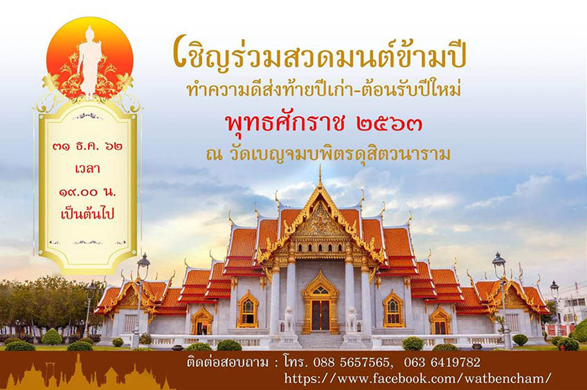 วัดเบญจมบพิตรดุสิตวนารามราชวรวิหาร ขอเชิญชวนพุทธศาสนิกชน ชาวกรุงเทพฯ ตลอดจนนักท่องเที่ยวเข้าร่วมพิธี สวดมนต์ข้ามปี 2562 เข้าสู่ปี 2563 เสริมมงคลชีวิตสดใส ในวันที่ 31 ธันวาคม 2562-1 มกราคม 2563