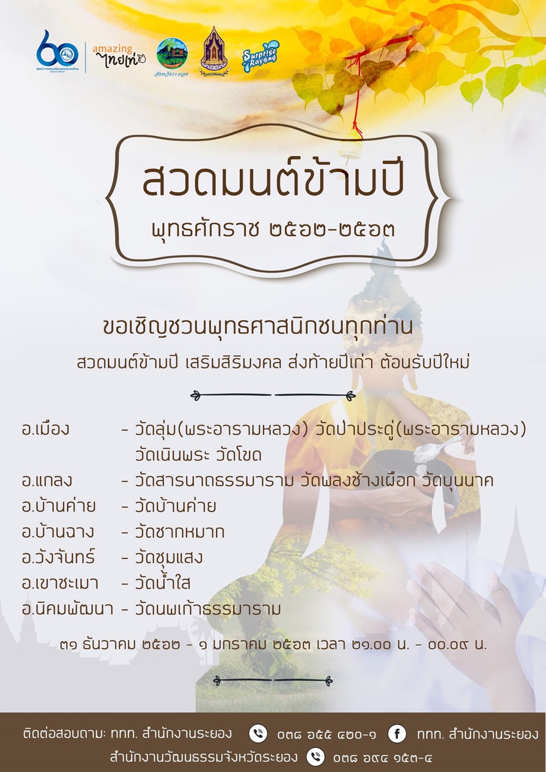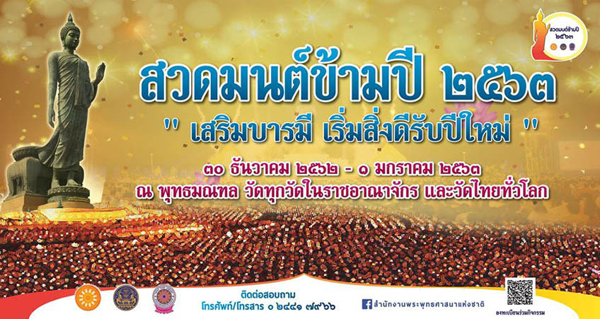 ขอเชิญพุทธศาสนิกชนร่วมสวดมนต์ข้ามปี 2563 วันที่ 30 ธันวาคม 2562-1 มกราคม 2563 ณ พุทธมณฑล วัดทุกวัดในราชอาณาจักร และวัดไทยทั่วโลก สอบถามรายละเอียดเพิ่มเติมได้ที่ กลุ่มประชาสัมพันธ์และเผยแพร่ สำนักงานพระพุทธศาสนาแห่งชาติ โทร. 0-2441-7966 สถานที่ : ลานด้านหน้าองค์พระประธานพุทธมณฑล จังหวัดนครปฐม เวลา : 30 ธันวาคม 2562 เวลา 17.19 น.เป็นต้นไป เว็บไซต์ : สำนักงานพระพุทธศาสนาแห่งชาติ