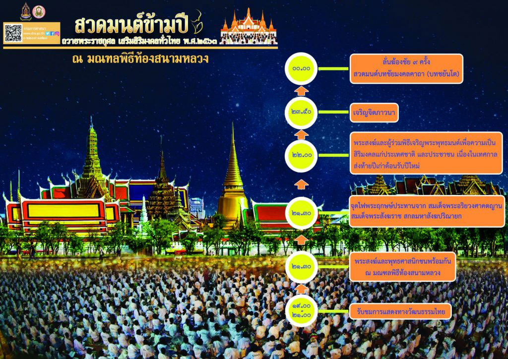 ร่วมสวดมนต์ข้ามปี เสริมสิริมงคลชีวิต ณ มณฑลพิธีท้องสนามหลวง ระหว่างวันที่ 31 ธันวาคม 2562 – 1 มกราคม 2563 โดยมีกำหนดการดังนี้